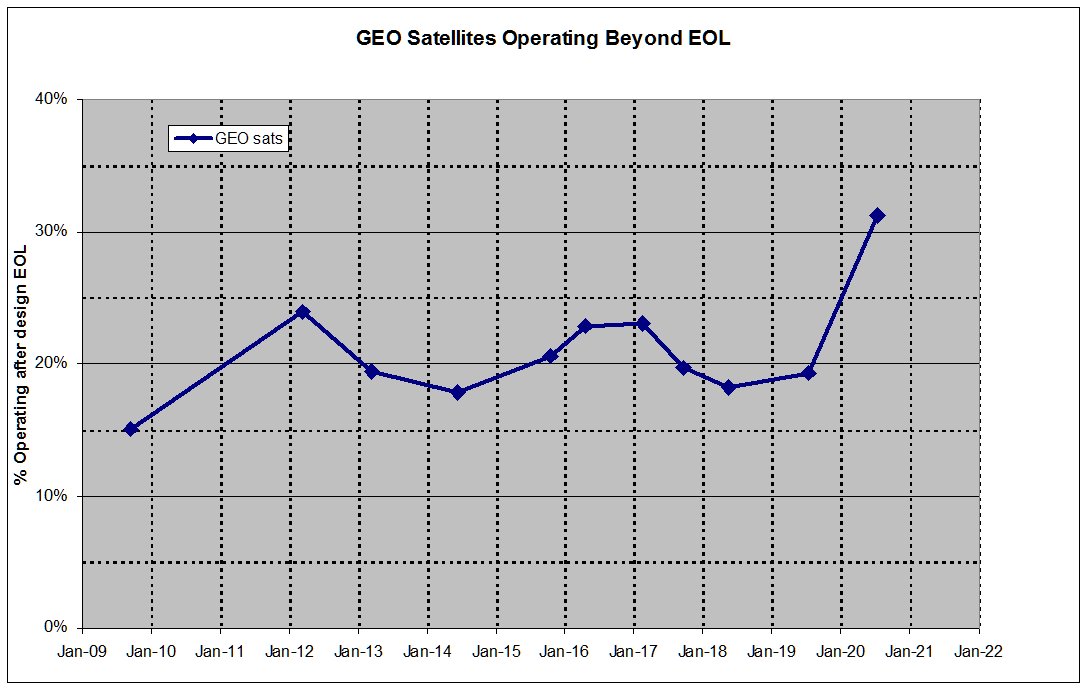 Research firm TelAstra of Los Angeles found that in 2020, some 31% of commercial geostationary comsats remained in service past their expected retirement, more than double the number of satellites putting in extra time in 2009.